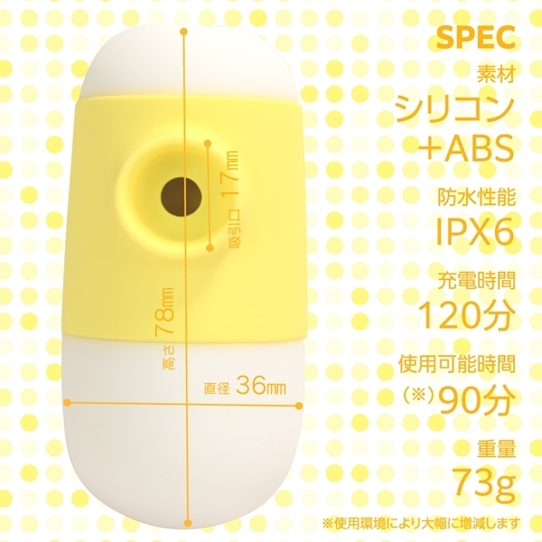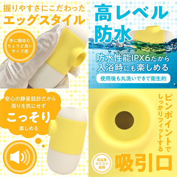 手にフィットするエッグスタイルの吸引ローターです♪可愛らしいデザインに、高性能な静音モーターを搭載しています!タマゴ型フォルムの上部にボタンを配置し、片手でもスムーズに操作可能です♪吸引口には柔らかく高品質なシリコン素材を採用し、ピンポイントにしっかりフィットして快適な真空状態を演出!7パターンの吸引アクションを搭載しており、強弱の調整も自在に楽しめます♪約120分で満充電でき、最大約90分間の連続使用が可能!(使用環境により変動します!)さらにIPX8相当の高い防水性能を備えているため、使用後も丸洗いできて衛生的です♪コンパクトながら多機能な、使いやすさにこだわったアイテムです! |